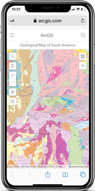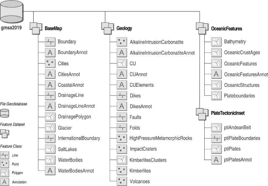 Le SIG de la GMSA a été structuré dans le logiciel ArcGIS 10.2.2. Pour cela, un fichier de géodatabase a été créée avec les jeux de données suivants : carte de base, sources, géologie, structures océaniques et plaques tectoniques. Chacun de ces jeux de données est composé d’entités ou de classes d’entités associées ; par exemple, la géologie comprend les classes d’entités des unités chronostratigraphiques, des failles, des plis, des dykes basiques, des carbonatites alcalines volcaniques et intrusives, des schistes bleus et des éclogites, des champs de kimberlites, des cratères d’impact, des volcans quaternaires et leurs annotations, qui identifient ces entités sur la carte . La structure du SIG de la GMSA est illustrée à la figure 8. La GMSA a une échelle de 1:5 000 000, suit le système de coordonnées WGS-1984 et sa sortie graphique a une projection polyconique avec une latitude d’origine à l’équateur et longitudinale. origine au méridien central de 59 à l’ouest de Greenwich. Le GMSA a été rendu public le 26 novembre 2019, en SIG (MXD, style, File Geodatabase), PDF haute résolution (version imprimable), PDF basse résolution (web), TIFF et polices, permettant la recréation du Modèles CU. De plus, le service Web et ArcGIS Online ont été mis en œuvre ; ce dernier peut être facilement déployé sur un appareil mobile (Fig. 9).