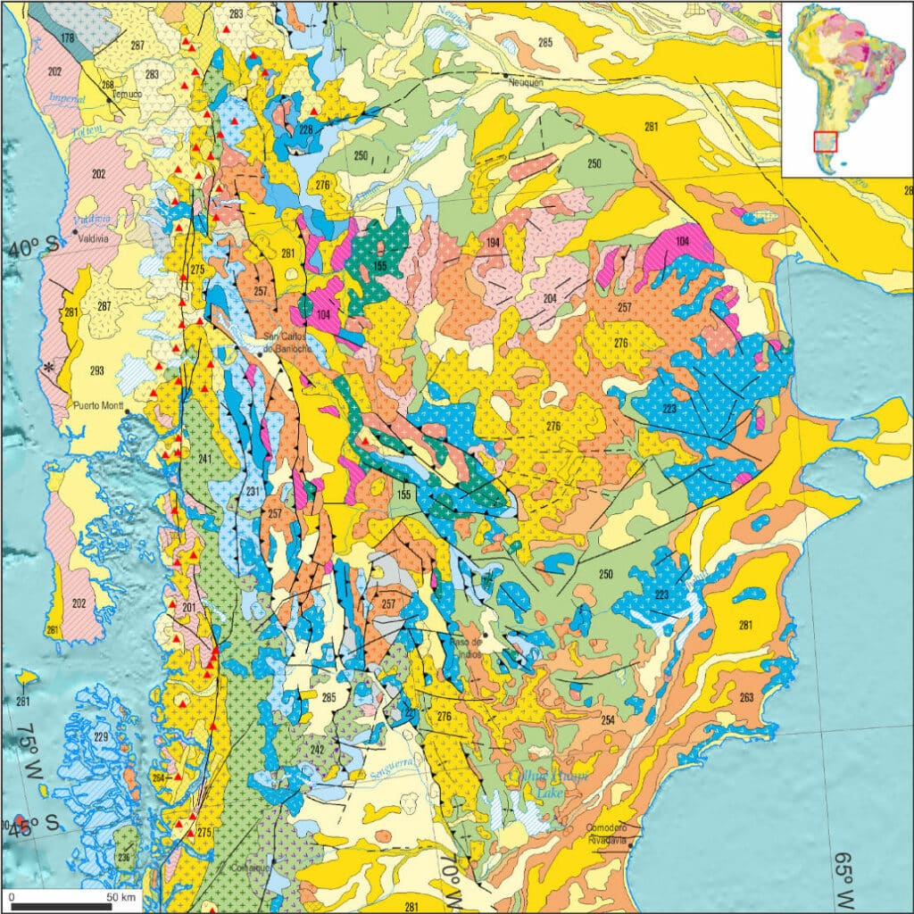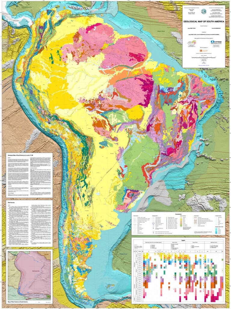 La troisième édition de la Carte géologique de l’Amérique du Sud (GMSA), à l’échelle 1/5 000 000, a été réalisée par la sous-commission sud américaine de la Commission pour la Carte Géologique du Monde (CGMW) et l’Association des études géologiques et minières ibéro-américaines et la coopération des études géologiques de la Colombie, du Brésil, de l’Argentine, du Chili, du Pérou, de l’Uruguay et de l’Équateur et l’aide de plusieurs universités et instituts de recherche.