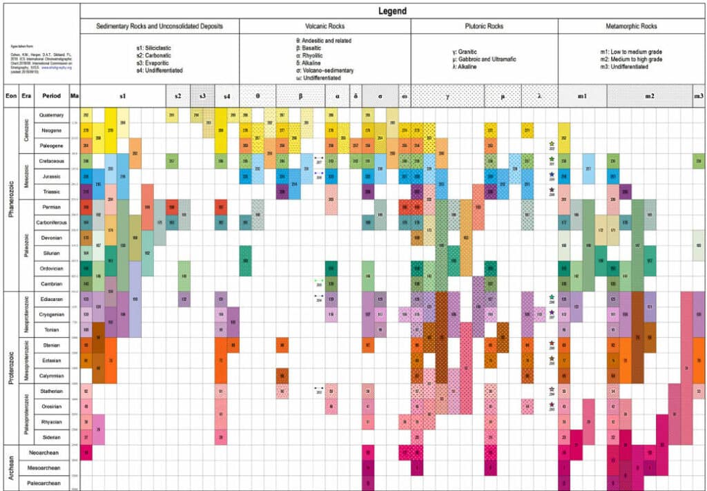 Les unités chronostratigraphiques (UC) du GMSA ont été classées selon l’âge et le type de roche ou de gisement. Chaque âge a été différencié en fonction du système/période, et toutes les roches ont été différenciées comme roches sédimentaires, ignées ou métamorphiques. Les roches sédimentaires étaient groupés en siliciclastiques, carbonatés, évaporitiques ou indifférenciés ; roches volcaniques andésitiques et apparentées, basaltiques, rhyolitiques, alcalines, volcano-sédimentaires ou indifférenciées; roches plutoniques granitiques, gabbroïques et ultramafique, ou alcaline ; et, enfin, des roches métamorphiques aussi basses à grade moyen, moyen à élevé ou indifférencié.