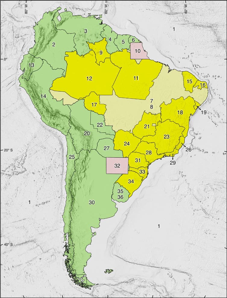 Nous apprécions également les contributions des 58 collaborateurs des commissions géologiques d’Amérique du Sud, des universités et des centres de recherche. Le projet GMSA a été financé par le Service géologique colombien et le Service géologique du Brésil.