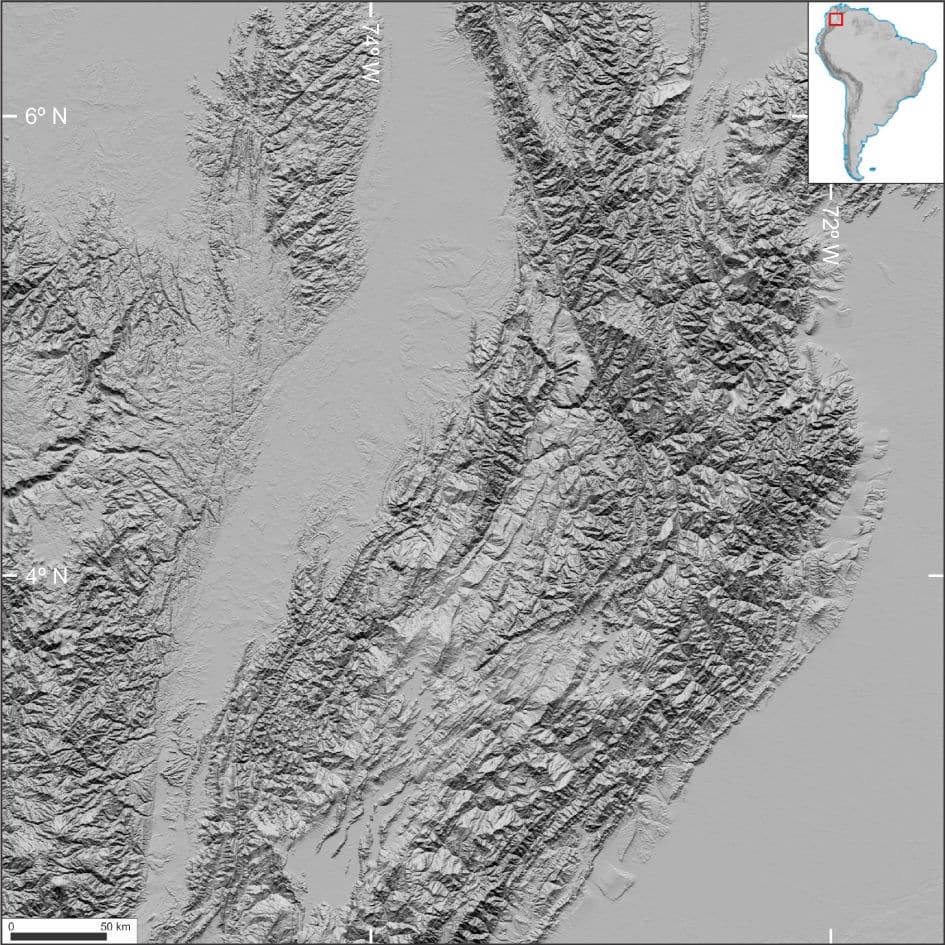 Chaque image a été créée avec une simulation d’illumination solaire avec des azimuts de 315o et 45o et une hauteur de 45o pour simuler le soleil à environ 10 heures à Bogotá, en Colombie. Chaque image en relief ombré de 45o a été affichée avec une transparence de 50% superposée à celle de 315o d’azimut. Parce que la cordillère des Andes traverse le continent du sud au nord, ce type d’affichage évite les parties très sombres d’une image, permettant la mise en valeur 5 des caractéristiques du terrain pour faciliter l’observation des principales structures géologiques.